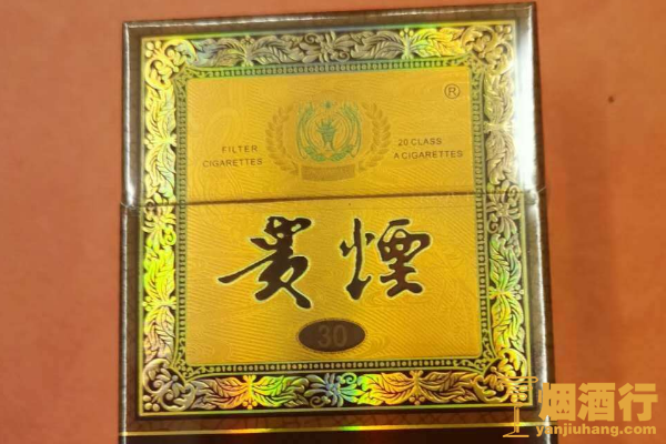 贵烟(国酒香·30)是一款高档卷烟,包装较为典雅,采用了褐色作为底色,正面印有金色的纹样,其口感绵柔,味道香醇,带有一股茅台酒的香气。