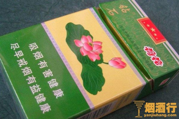 钻石(荷花)的包装以绿色和黄色为主,正面中间印有荷花图案,其口感舒适,味道香浓,烟气纯正,回味干净,有着非常好的吸食体验,性价比很高。