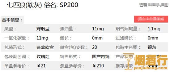 七匹狼香烟核心参数: