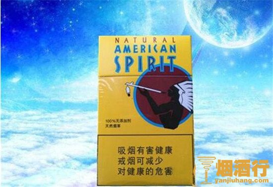 烟盒采用明黄色为主色,配以印第安人图案,异国风情味道浓郁。烟盒上标注着100%无添加剂,天然烟草,这香烟烟阻有点大,但很耐抽。2018美国精神香烟多少钱一包?它的市价为45元/包,相对于同类的纯天然无添加烟草,它的性价比还是很不错的。