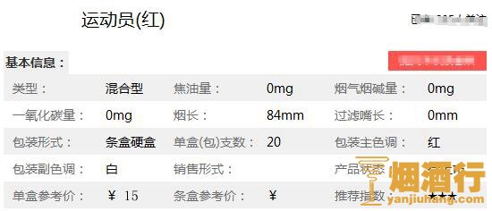 运动员香烟核心参数: