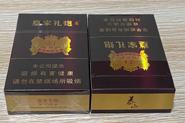 泰山(皇家礼炮21响)采用黑色硬盒包装,正面印有皇家专属图案,风格低调典雅,香烟的烟气饱满,带有淡淡的酒香味道,后劲较大。