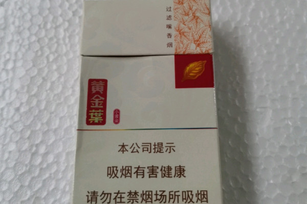 黄金叶(小黄金)的包装以白色为主,正面右上角有烟叶的纹样和图案,左侧印有黄金叶的字样,其口感柔顺,烟气细腻适中,香味纯正,回味甘甜。