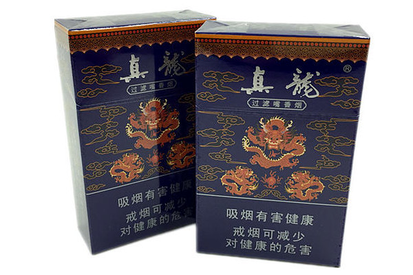 真龙(娇子)的包装以蓝色为主,正面有细小的祥云纹样和三个团龙图案,上半部分印有真龙的字样,其烟味醇厚,入口柔顺,带有淡淡的香精味,但烟气较为杂乱。