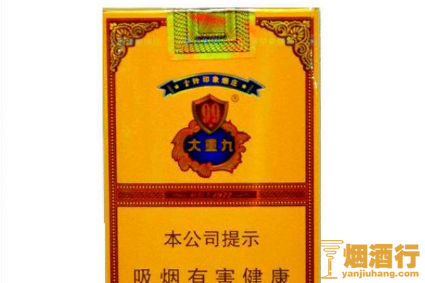 云烟(软大重九)采用了黄色作为底色,正面印有和纹章相似的图案,其口感柔和,劲道适中,味道以烟草本香为主,并带有一定的果香味,回味香甜润滑。