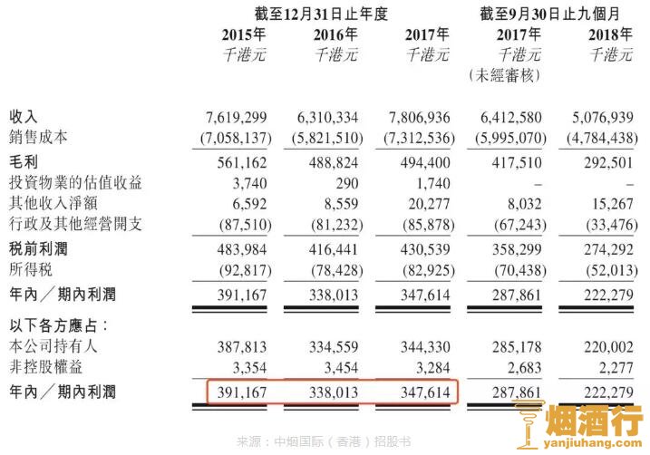 财务数据显示,2015年-2017年和2018年前三季度,中烟国际(香港)分别实现收入76.19亿港元、63.1亿港元、78.07亿港元和50.77亿港元,同期净利润分别达到了3.91亿港元、3.38亿港元、3.48亿港元及2.22亿港元。