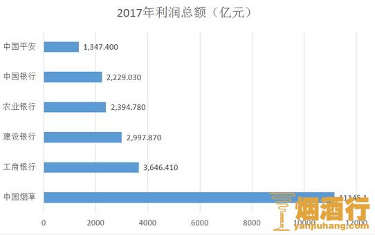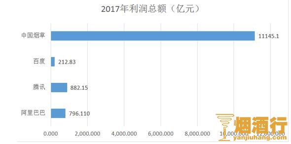 我们熟知的BAT三大互联网巨头,2017年税前总利润分别是212.83亿元、796.11亿元和882.15亿元。从图中可以更直观的看出中国烟草总公司利润中,这些互联网巨头的总利润只是中国烟草的一个零头。